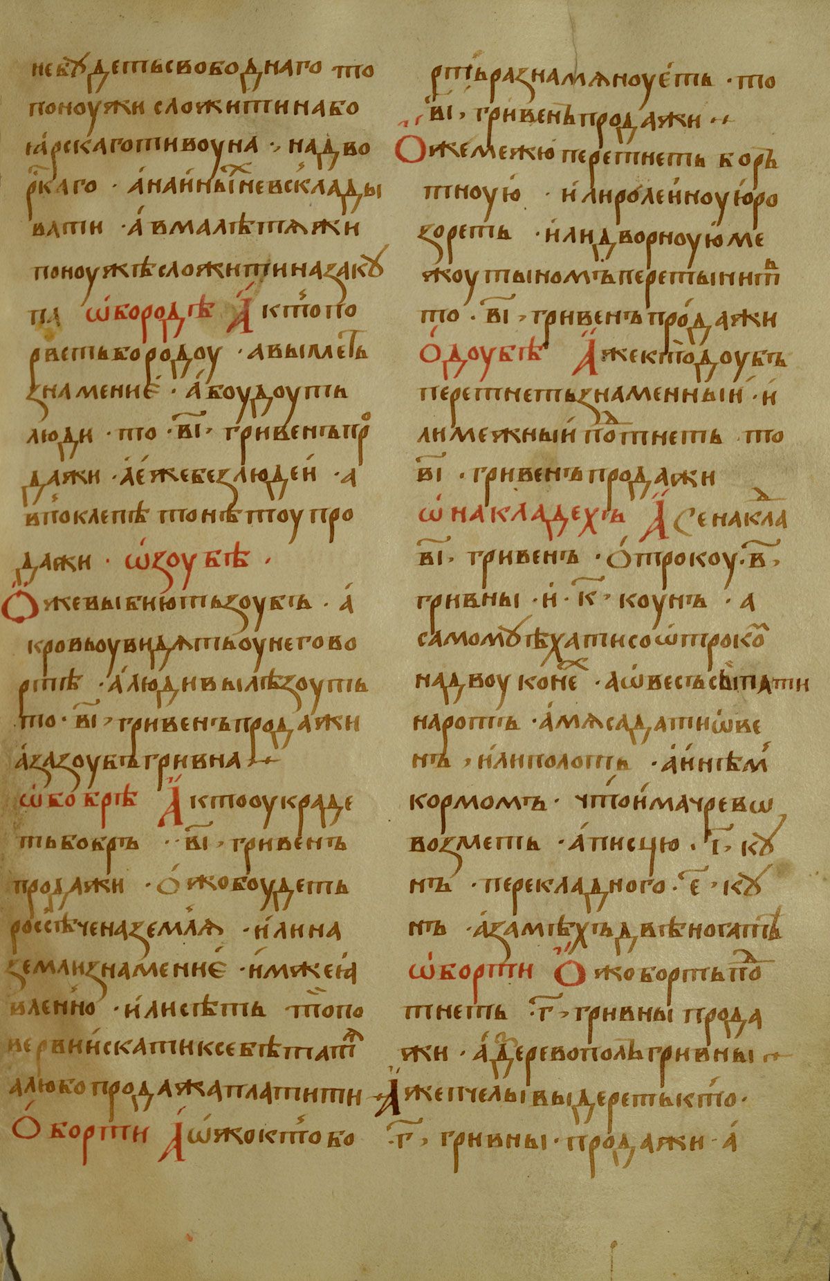 Обычно «Русская Правда» начинается со статьи об убийстве человека (см. первое фото). В переводе на современный язык эта статья говорит, что «Если человек убьет человека, то мстит брат за (убийство) брата, или отец, или сын, или двоюродный брат, или племянник со стороны брата; если же не будет никого, кто бы отомстил за него, то положить за убитого 80 гривен, если (убитый) будет княжим мужем или княжеским тиуном; если (он) будет русин, гридин, купец, боярский тиун, мечник, изгой или словенин, то положить за него 40 гривен».