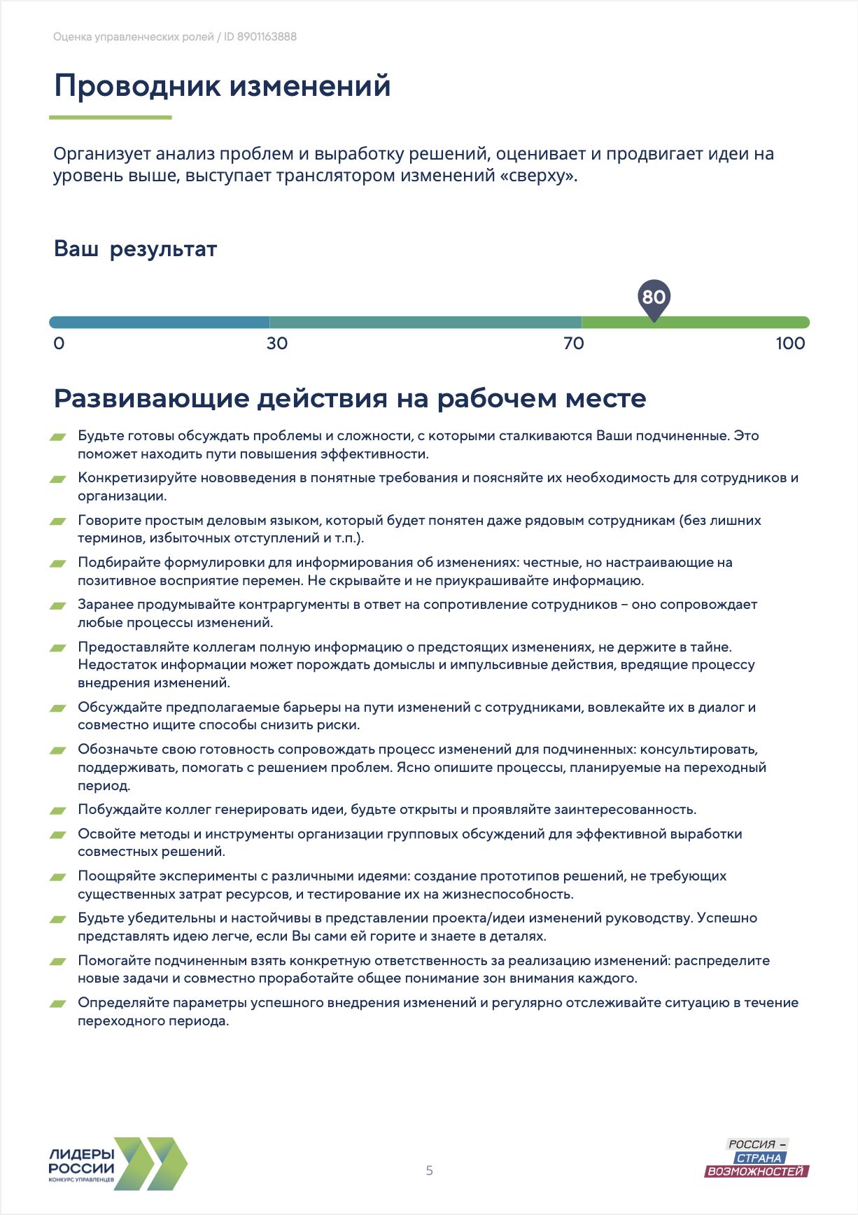 Месяца полтора назад РСВ проводило тестирование для оценки управленческих ролей. Эта методология находится в стадии тестирования, и им понадобился большой массив данных, на которых они могли бы откалибровать этот инструмент. Они решили использовать участников конкурса «Лидеры России» в качестве тестировщиков этого инструмента. Я прошел это тестирование, которое состояло в том, что в целом множестве неоднозначных управленческих ситуаций надо было выбрать тот путь разрешения ситуации, который более удобен. Как я уже сказал, на прошлой неделе пришел результат этого тестирования.