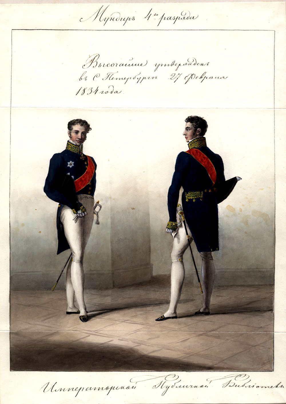 Директору библиотеки отводится почетная роль в этом повелении, поскольку он являлся чиновником 4-го разряда. А чиновникам такого ранга полагалось носить специальный мундир (см. фото). Для примера можно отметить, что пуговицы, как для праздничного, так и для повседневного мундира, должны были быть медные с гербом Императорской Публичной библиотеки.
