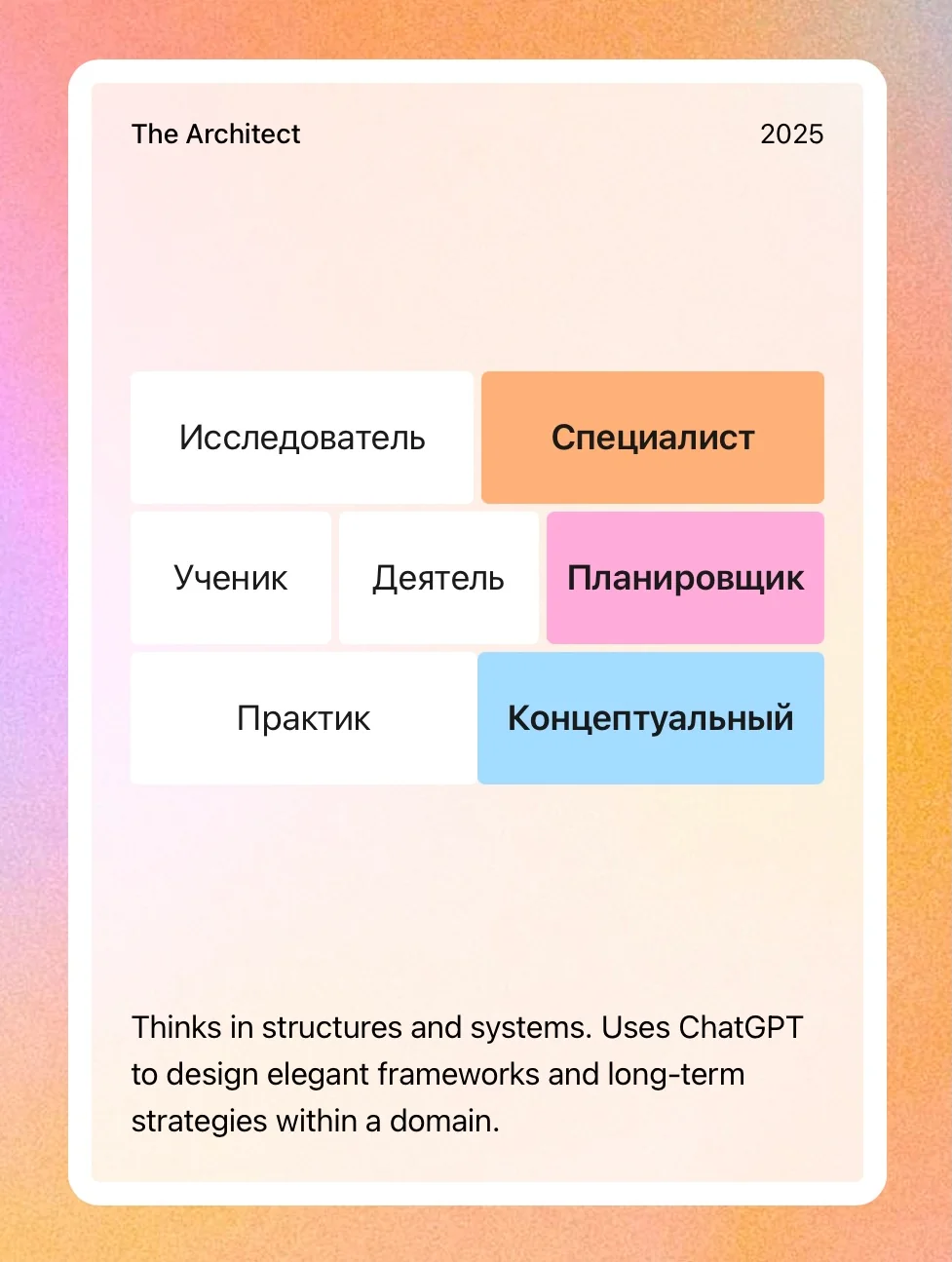 Было приятно получить подтверждение того, что уровень моего использования ChatGPT – это уровень Chief Digital Transformation. По мнению ChatGPT, я являюсь архитектором, который мыслит структурно и системно. Эти выводы сделаны на основании того, что я проектирую элегантные решения в рамках долгосрочно работающих стратегий.