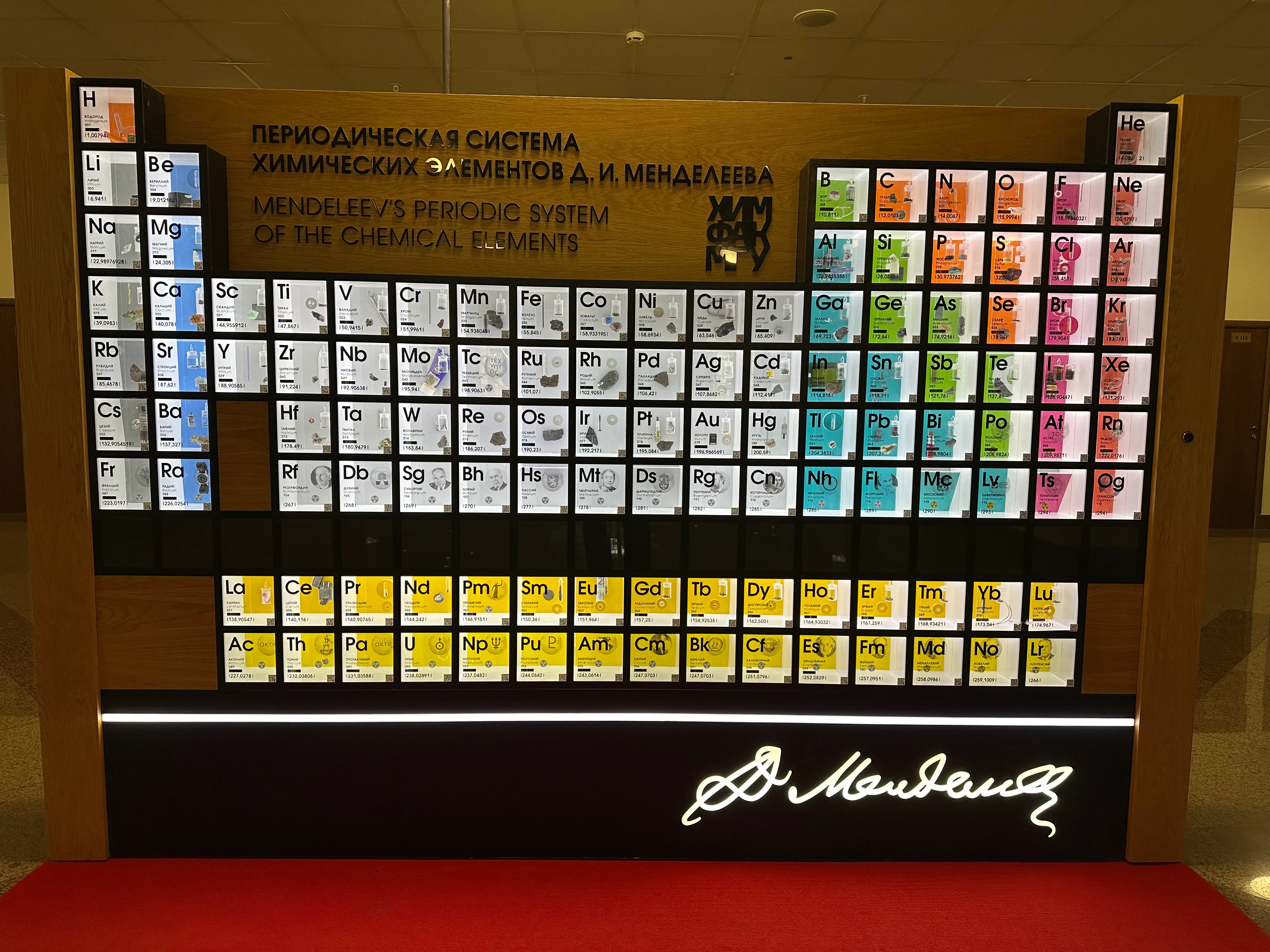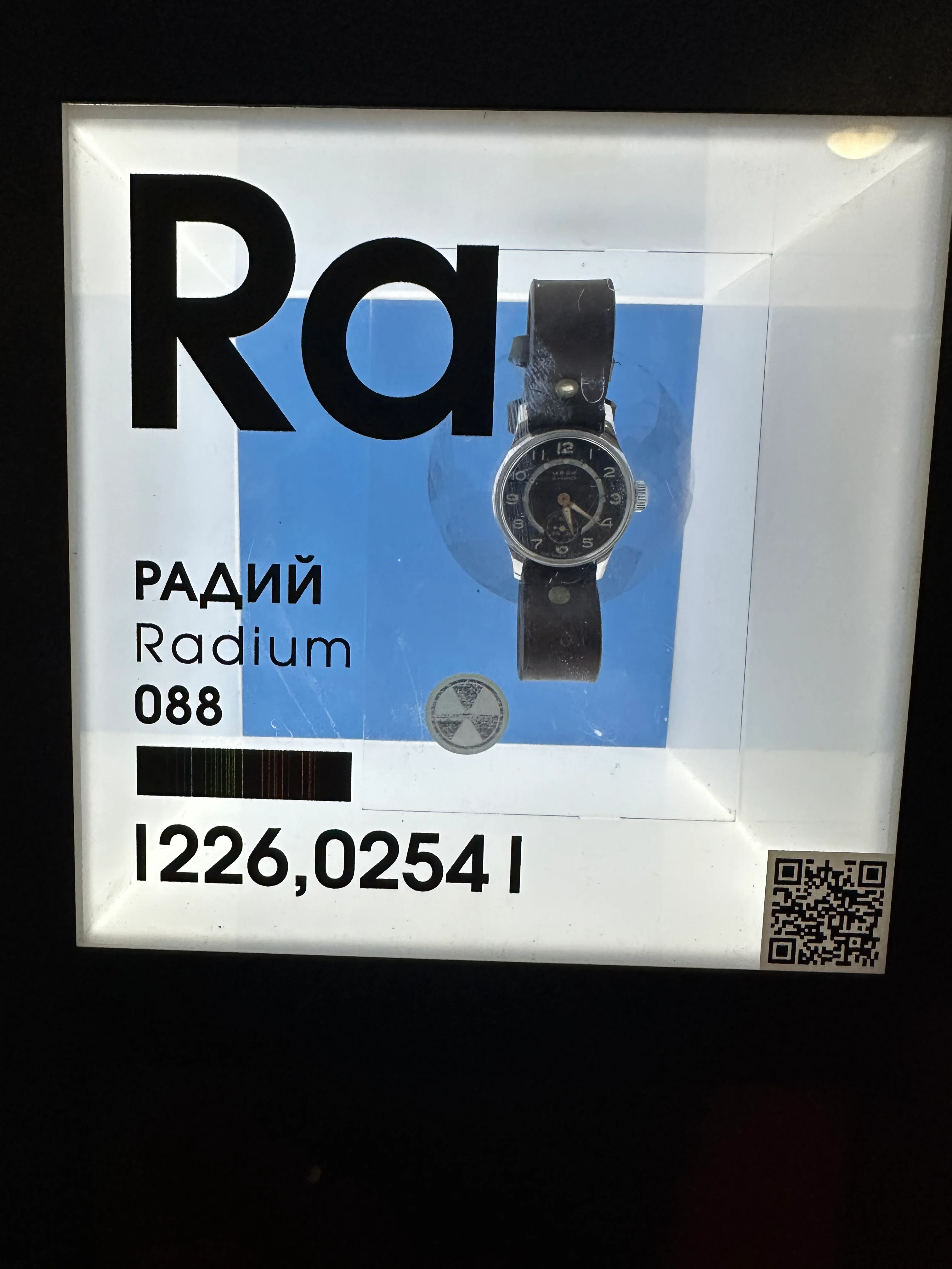 Возвращаясь к инсталляциям, отмечу, что мне больше всего понравился стенд, отражающий текущее состояние периодической системы химических элементов Д.И. Менделеева (см. второе фото). Сколько же разных элементов человечество смогло открыть за последние несколько десятилетий! Для каждого элемента на этом стенде подобраны предметы, материалы или фотографии, ассоциирующиеся с данным элементом. Моё внимание, естественно, привлёк радий (см. третье фото).